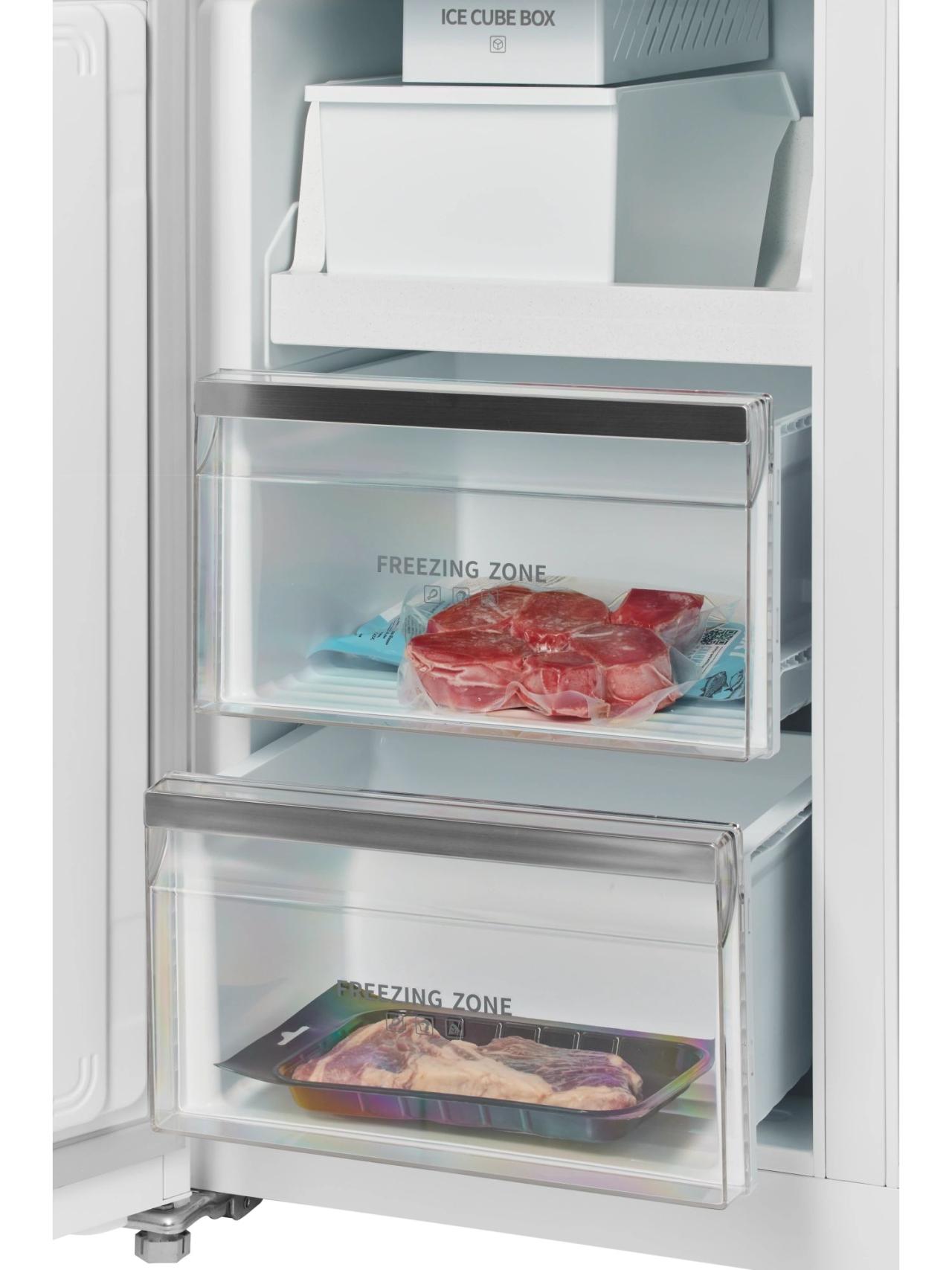 Внутреннее пространство продумано до мелочей: удобные выдвижные ящики на металлических направляющих, включая мультитемпературную зону FLEX ZONE с выбором -4, 0 или +4 °C, помогают поддерживать оптимальные условия для разных продуктов. Фантомный сенсорный дисплей сохраняет минималистичный вид фасада и обеспечивает интуитивное управление.