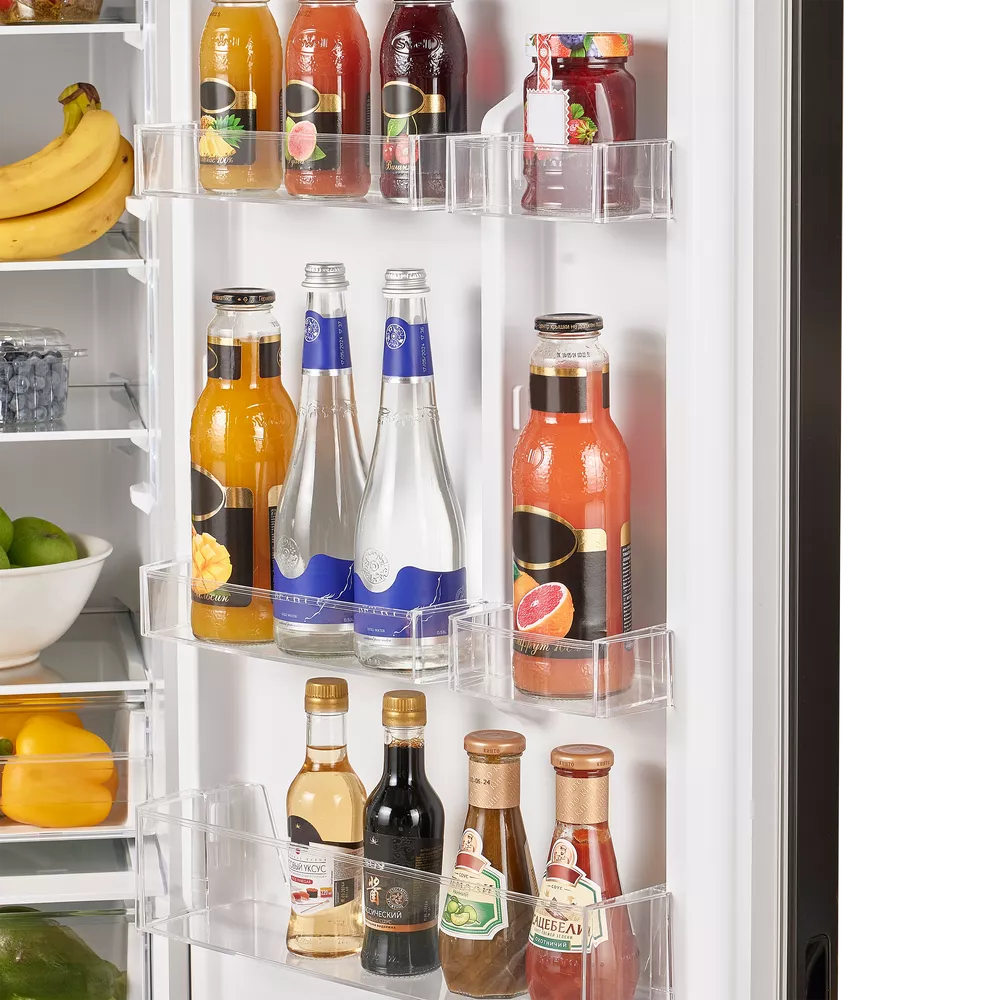 За равномерное распределение холода отвечает динамическое охлаждение: специальный вентилятор поддерживает оптимальные условия на каждой полке и в любом отделении. Внутреннее пространство продумано для гибкой настройки — высота полок и отсеков регулируется, полки выполнены из закаленного стекла, а комплектация включает подставку для яиц и форму для льда.