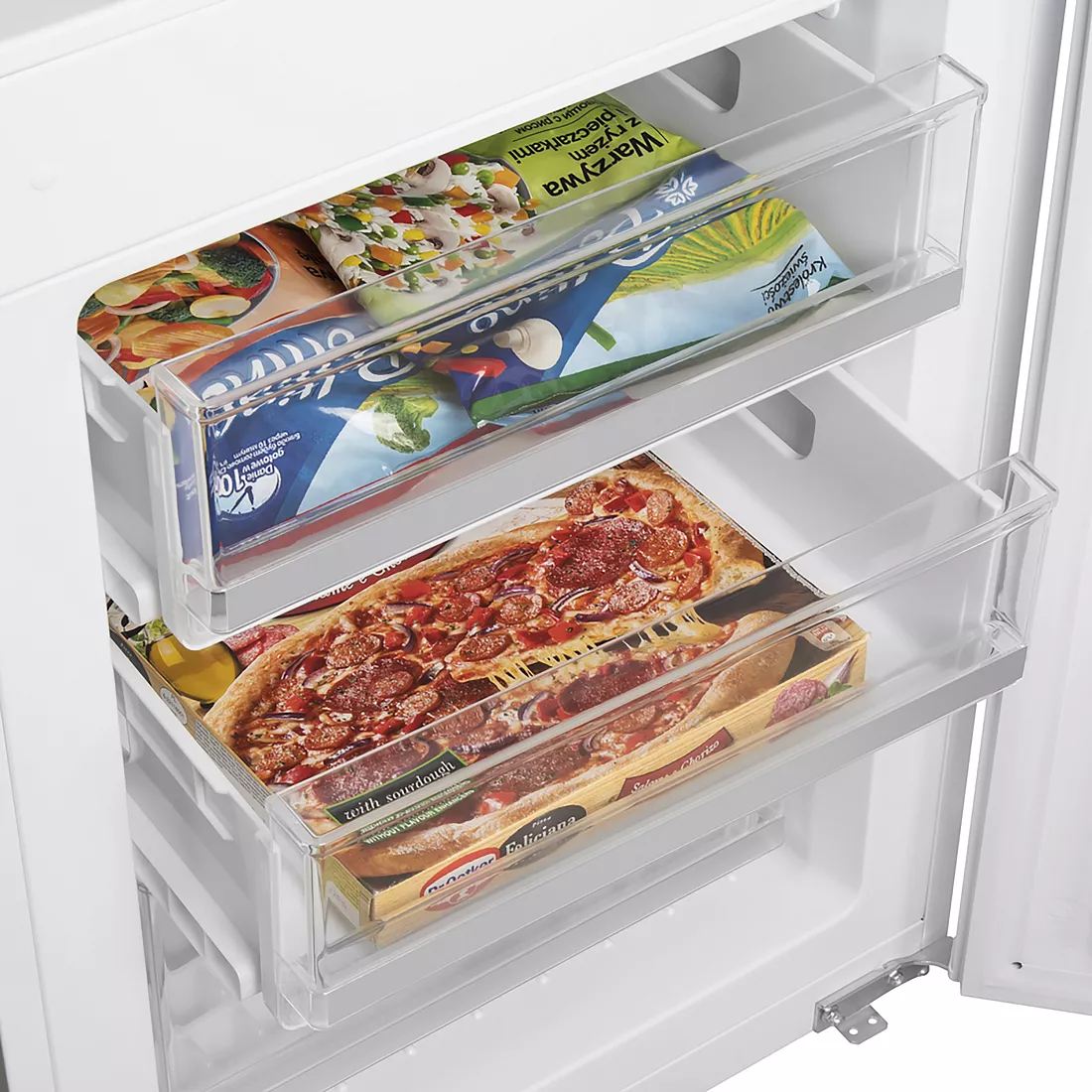 Внутри предусмотрены стеклянные полки с металлической окантовкой, ящик для фруктов и овощей, полки на двери и формочка для льда — всё, чтобы разложить продукты по категориям и быстро находить нужное. Низкий уровень шума 39 дБ позволяет установить прибор даже в кухне-гостиной, не жертвуя тишиной и уютом.