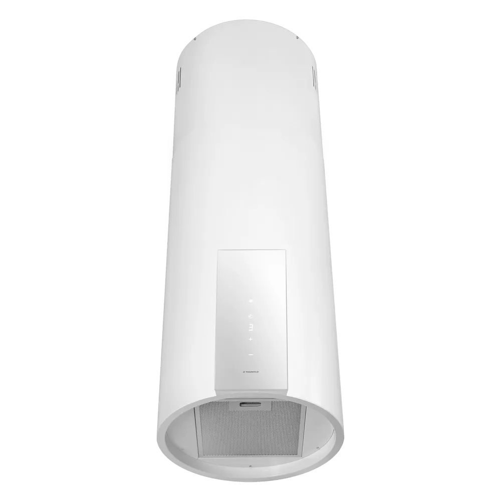 Кухонная вытяжка MAUNFELD ALBA 39 Isla белый — стильное решение для островной планировки и просторных кухонь. Цилиндрический корпус аккуратно крепится к потолку над варочной поверхностью и органично дополняет современный интерьер.