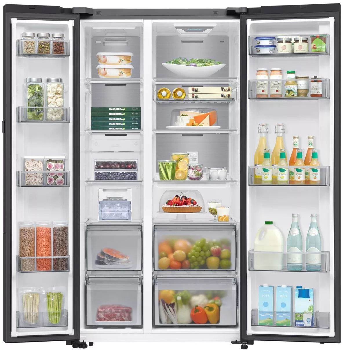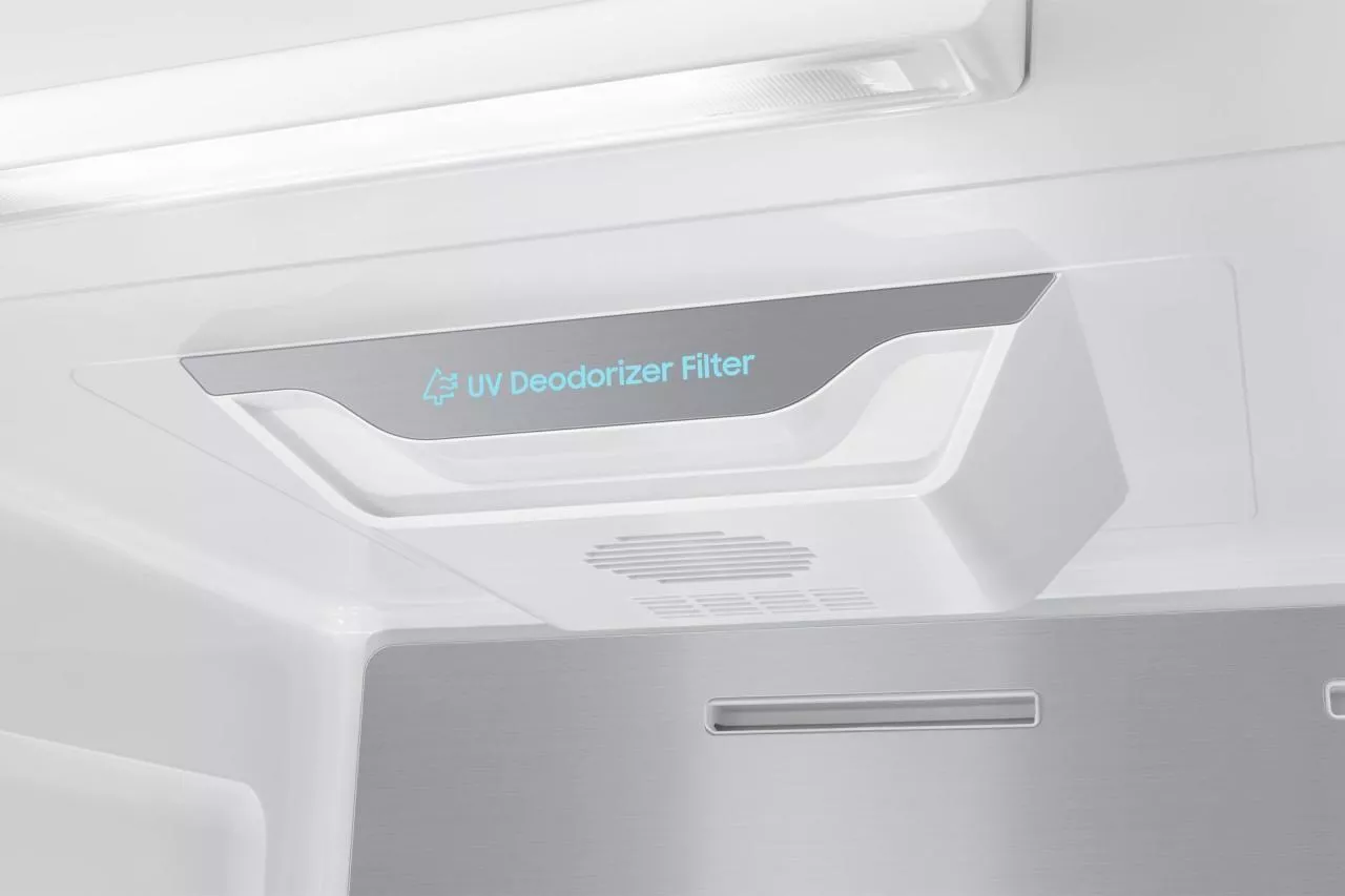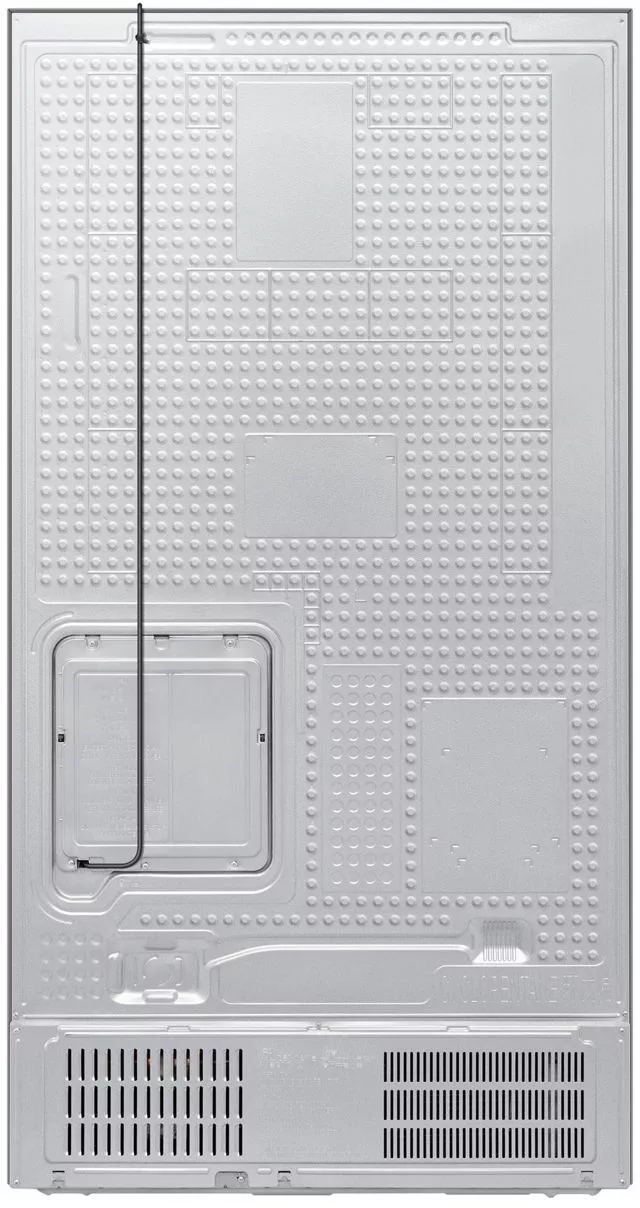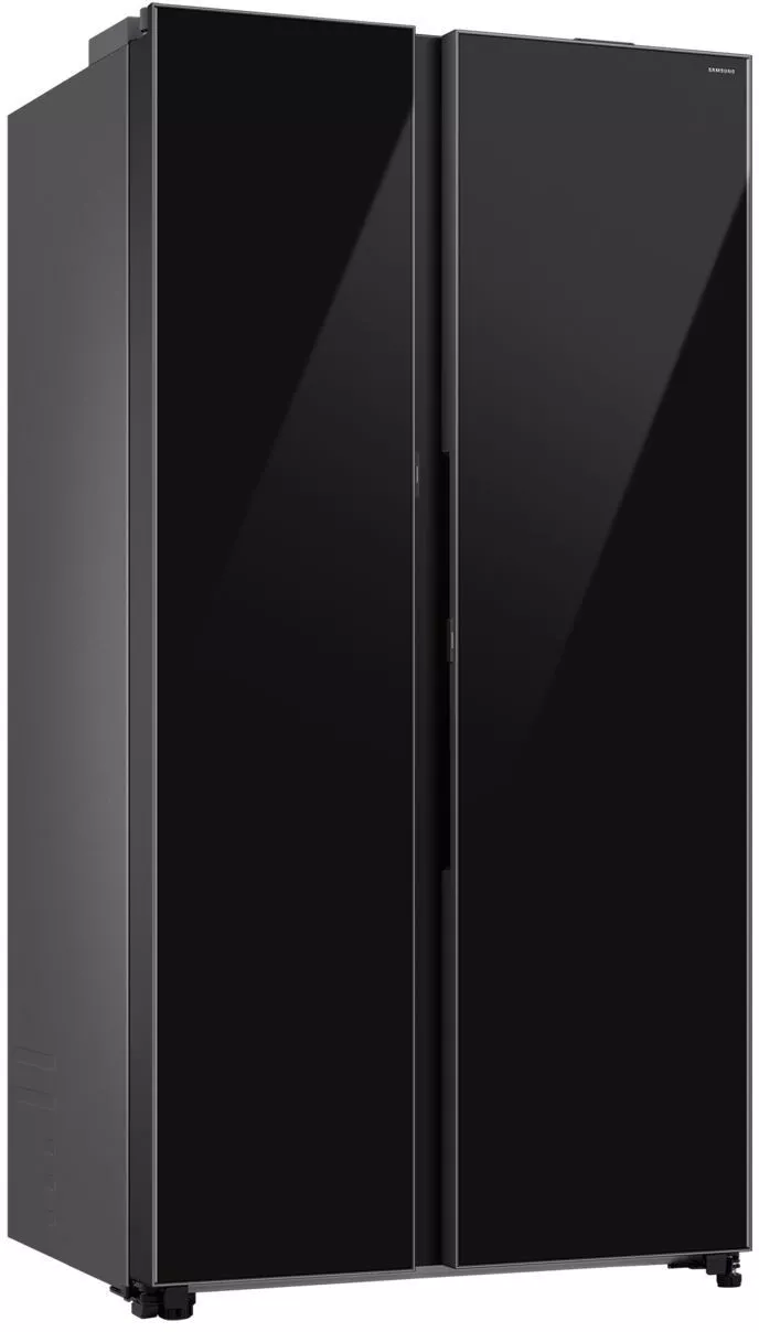 Управление осуществляется как с внутренней электронной панели, так и дистанционно через приложение SmartThings с поддержкой Wi-Fi и Bluetooth. В холодильной камере — 4 полки из закаленного стекла (с фиксаторами против выдвижения), 5 дверных карманов, полка для бутылок и 2 ящика для овощей и фруктов. В морозильной камере — 4 полки, 5 дверных карманов и 2 прозрачных пластиковых ящика. Обе камеры оснащены светодиодным освещением и индикацией температуры.