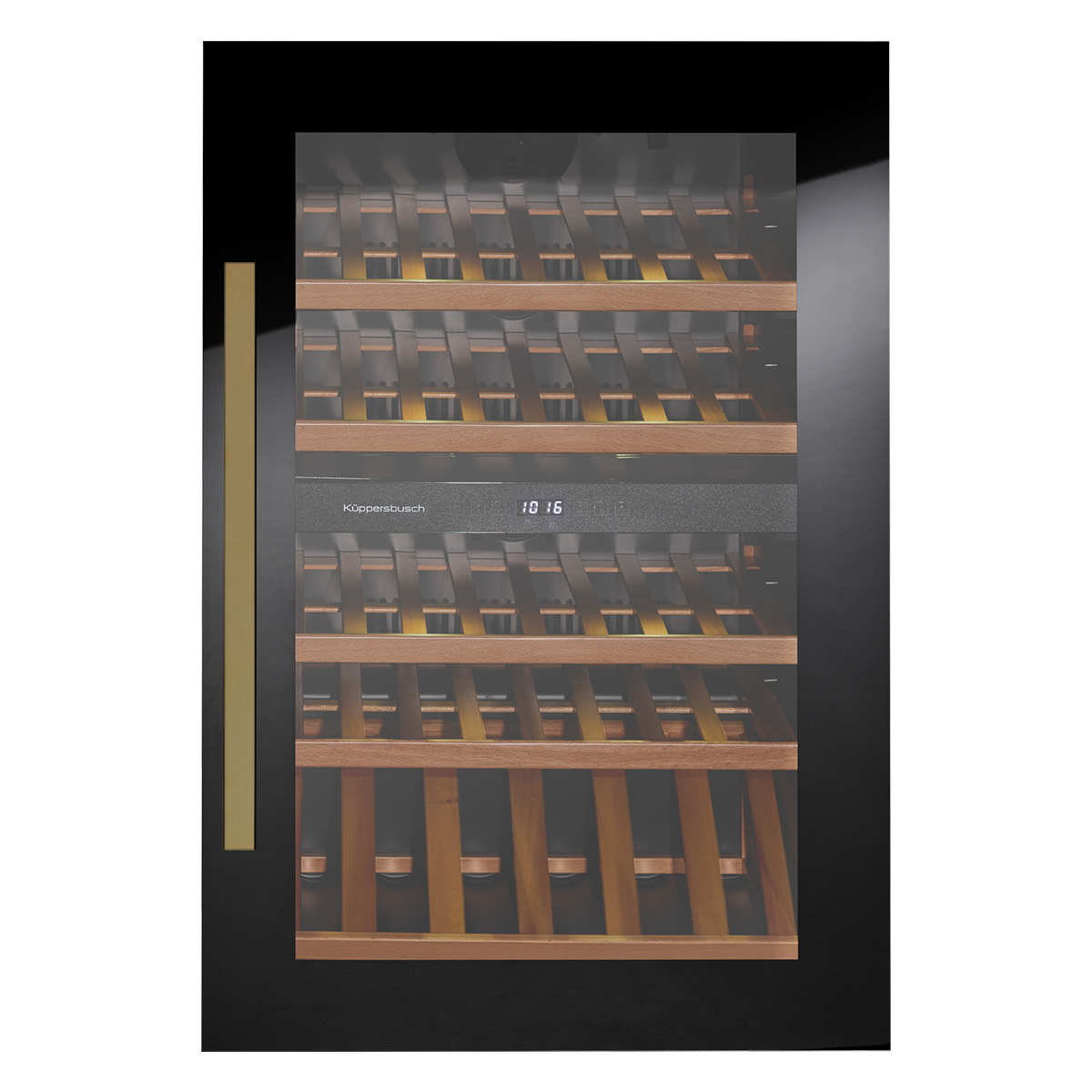 Встраиваемый винный шкаф Kuppersbusch FWK 2800.0 S4 Gold из премиальной серии K.8 — это эксклюзивное решение для хранения и созревания вин, сочетающее элегантный дизайн и передовые технологии. Модель выполнена в черном стекле с уникальным дизайном Gold, что придает ей роскошный и изысканный вид, способный стать акцентным элементом любой кухни. Вместимость составляет 52 бутылки, размещенные на 5 деревянных полках. Электронная система управления с цифровым дисплеем и нажимными кнопками обеспечивает точный контроль температуры в диапазоне 5–18 °C в двух независимых отделениях. Инновационная система охлаждения с динамической циркуляцией воздуха гарантирует равномерное распределение температуры и влажности по всему объему. Резервуар для воды обеспечивает дополнительное увлажнение, создавая идеальные условия для длительного хранения вин. LED-освещение деликатно подсвечивает коллекцию без нагрева. Шкаф оснащен полным набором сигнализаций: звуковой сигнал, световая индикация аварии, индикация температуры внутри и снаружи. Изменяемая навеска двери (угол открывания 90°) позволяет адаптировать установку под планировку. Низкий уровень шума 38 дБ обеспечивает комфортную эксплуатацию. Климатический класс SN–N гарантирует стабильную работу в различных условиях. Производство — бренд из Германии.