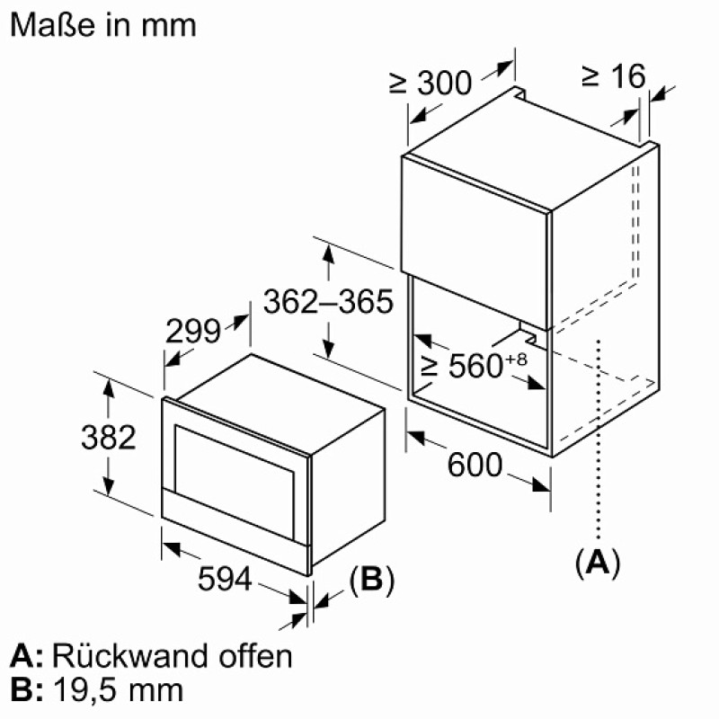 • Габариты ниши для встраивания (В × Ш × Г), см: 38–38.2 × 56–56.8 × 55