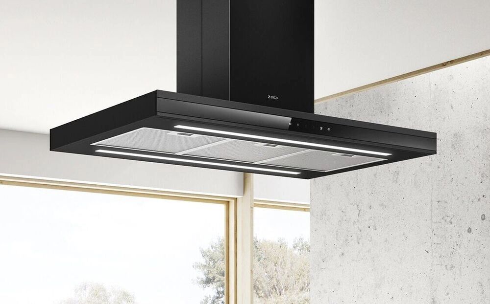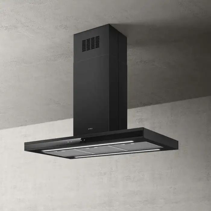 Вытяжка островная ELICA Adele IS BL MAT/A/90 X 60-PRF0182415 — решение для просторных кухонь и объединённых с гостиной пространств. Корпус матового чёрного цвета выглядит престижно и не требует сложного ухода, а минималистичный дизайн органично вписывается в современные интерьеры.